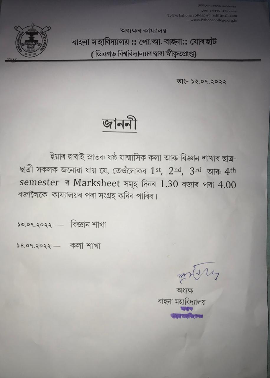 Read More →Established in 1966, Bahona College is a co-educational institution affiliated to Dibrugarh University, located 9 km north-east of Jorhat town on the bank of the Brahmaputra. The college offers Higher Secondary and Undergraduate programmes in Arts and Science, along with Distance Education courses under Dibrugarh University, KKHSOU, and ASOS. With 12 departments, 55 faculty members, and around 1200 students, the college is committed to providing quality and inclusive higher education to rural and economically backward communities of Assam.